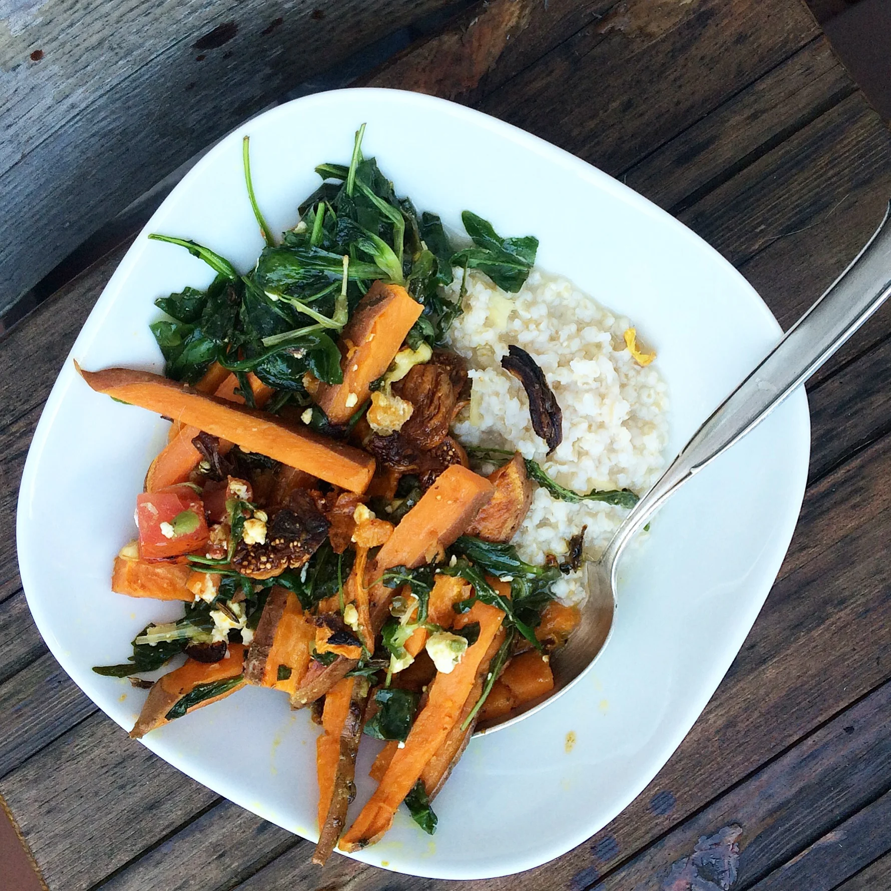 - Add the Kanji at the bottom of a plate and top off with your oven roasted veggies